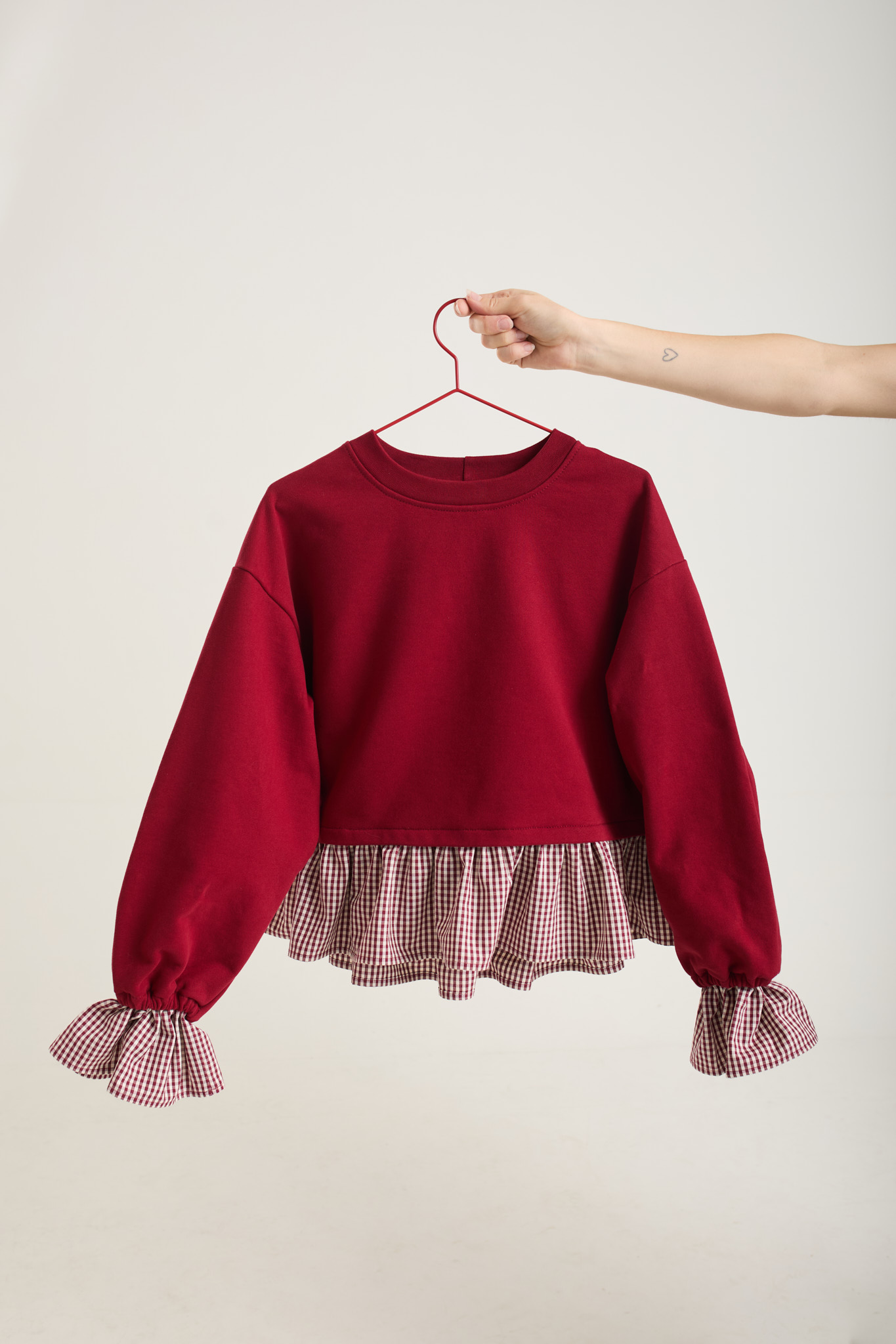 Na první pohled to vypadá, jako bys pod kratší mikinou měla vykukující košili. Ve skutečnosti je to ale jeden promyšlený kousek, naše vánoční limitka Barbora. Mikinovinu jsem si nechaly nabarvit na nádhernou červeno-bordó barvu, která působí úžasně slavnostně. Doplnily jsme ji o červeno-bílou kostku z pravého českého kanafasu. Dohromady to dokonale ladí a dává Barboře ten nejkouzelnější vánoční vibe.