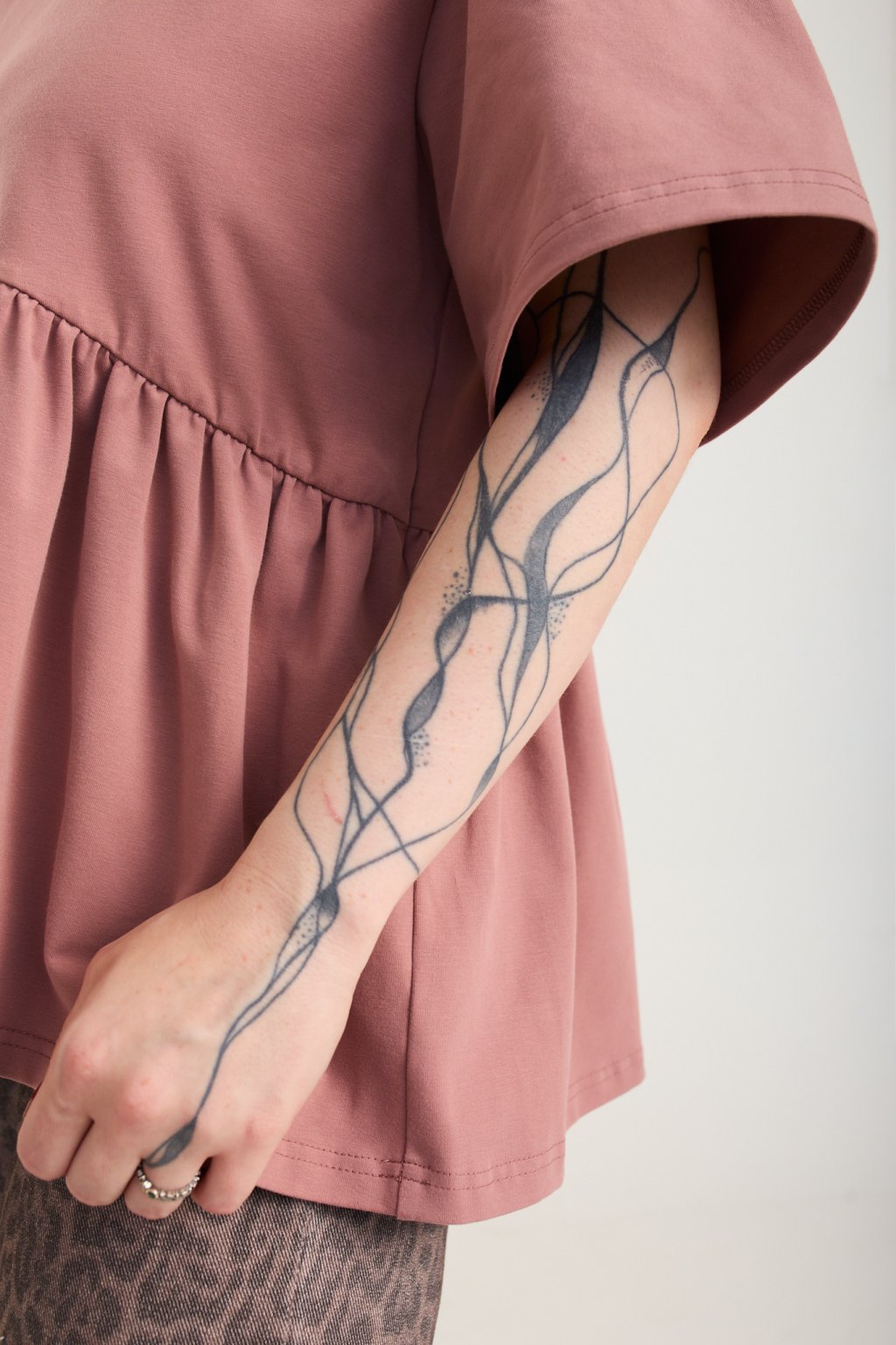 Normálně nosím všechna trička zastrčená, ale Ela se mi tak líbila, že jsem to zkusila. Mám M/L v modré a je úplně dokonalá. Materiál už klasicky jako vždy úplně nejvíc příjemný a barva nádherná. Překvapilo mě, jak moc dobře Ela vypadá i na postavě se širšími boky. 🫶