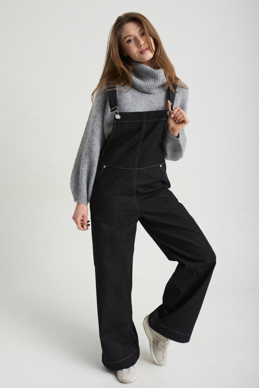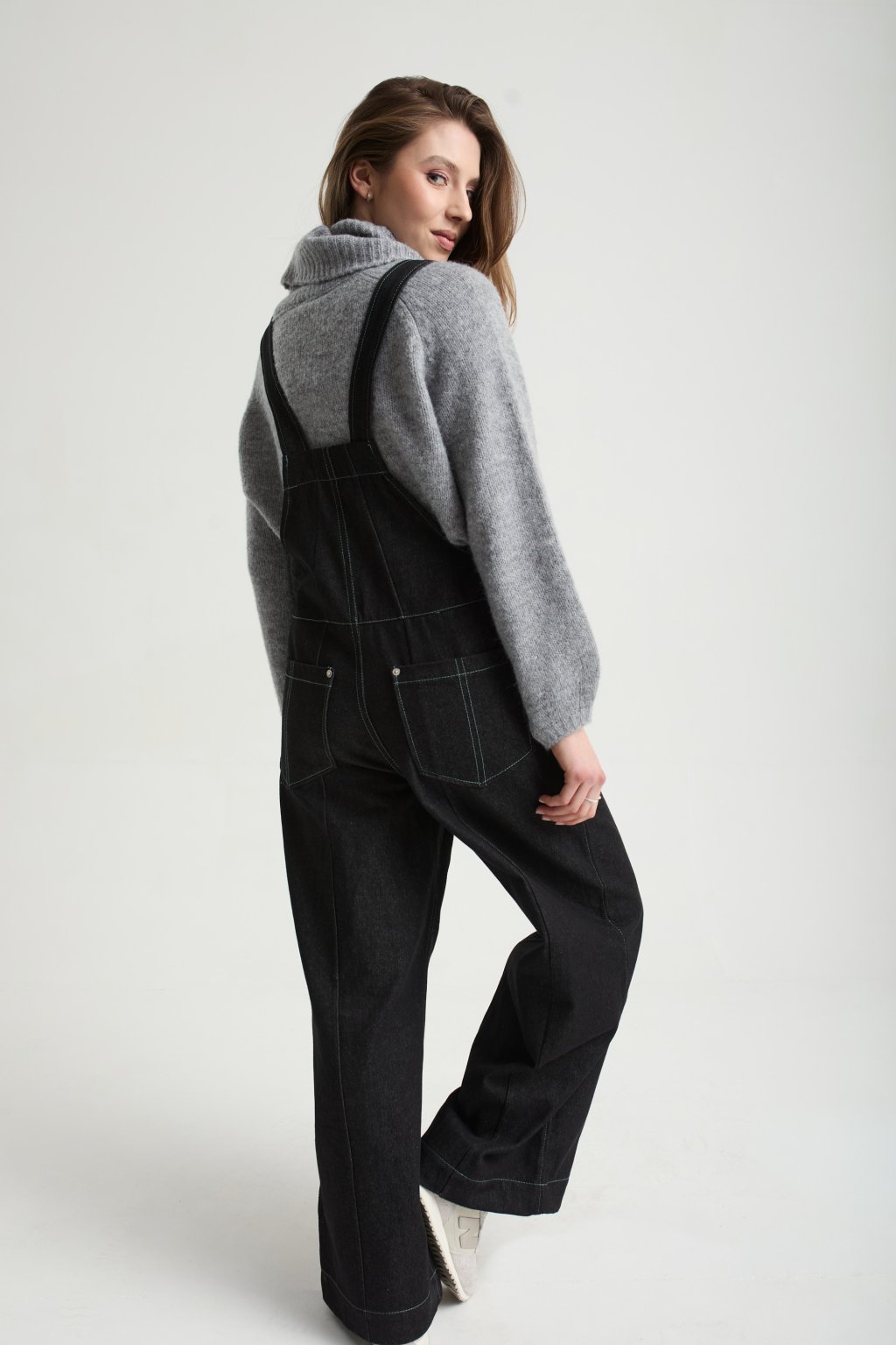 Lacláče Saša z pevného šedého denimu s mintovým prošíváním a širokými nohavicemi.